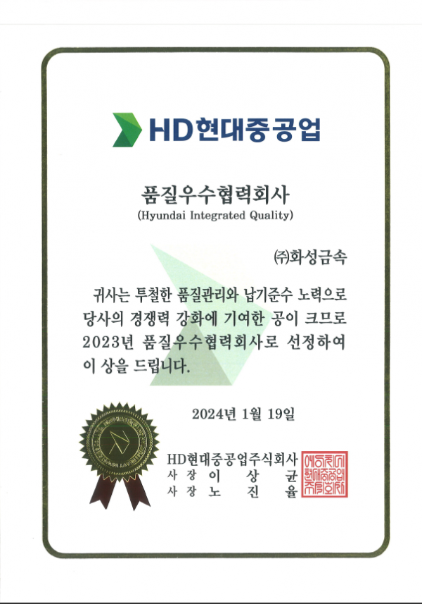2023년 현대중공업 품질우수협력회사로 선정되었습니다.